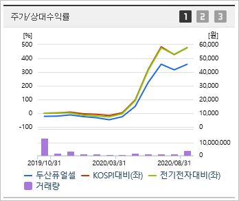두산퓨얼셀은 2020년 기준, ROE 7.17%, EPS 255원, PER 178.73배, BPS 4,800원, PBR 9.51배이며, 시가총액은 2조5,333억원으로 코스피 91위에 위치하고 있습니다. 외국인 비율은 4.95%입니다.