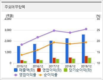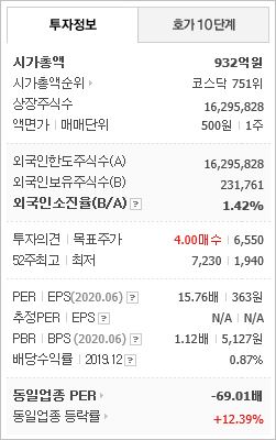2020년 기준 ROE 14.29%, EPS 1,702원, PER 74.33배, BPS 12,637원, PBR 10.01배이며, 배당률은 0.58%정도 됩니다. 시총은 3조7,536억원으로 코스피 63위에 위치하고 있으며 외국인 비율이 46.34%로 거래량도 활발합니다.