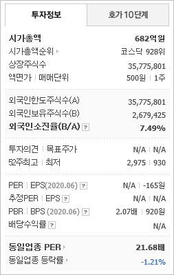 매출은 꾸준히 상승하고 있으며 미래지향적이나 ROE -2.61%, EPS -43, PER -105.44배, BPS 1,623원으로 현재 시점에서 기업실적이 좋다고는 할 수 없습니다. 시가총액 1,285억원 코스닥 571위를 하고 있습니다.