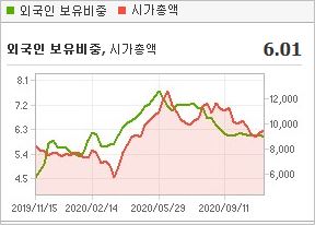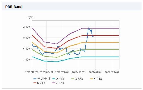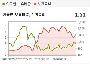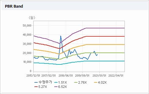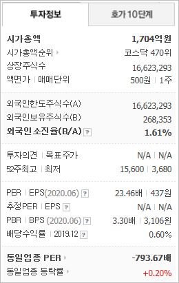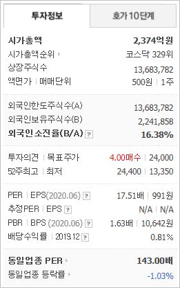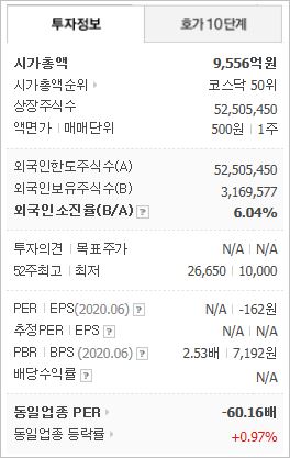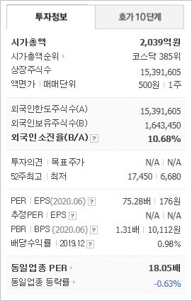 시가총액 9,556억원으로 코스닥 50위를 기록하고 있으며, 외국인소진율은 6.04% 입니다. 2020년 6월 기준, PBR 2.53배, BPS 7,192원이며, 배당수익률은 없습니다.
