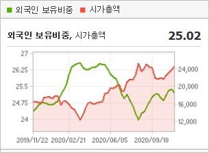 시가총액 3,696억원으로 코스피 358위를 기록하고 있으며, 외국인소진율은 6.03%입니다. 2020년 6월 기준, PER 260.67배, PBR 0.62배이며, 배당수익률(2019.12)은 1.28% 입니다.