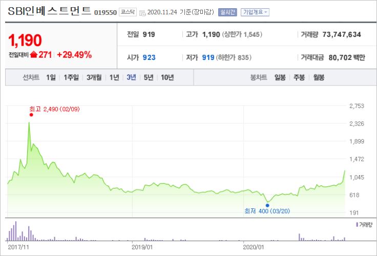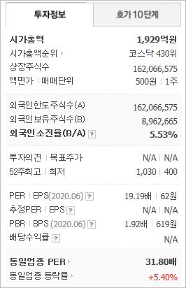 시가총액 1,929억원으로 코스닥 430위를 기록하고 있으며, 외국인소진율은 5.53%입니다. 2020년 6월 기준, PER 19.19배, PBR 1.92배이며, 배당수익률은 없습니다. 창투사 급등주 추천