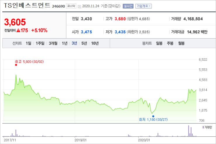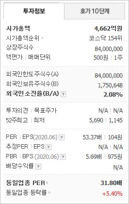 시가총액 4,662억원으로 코스닥 154위를 기록하고 있으며, 외국인소진율은 2.08%입니다. 2020년 6월 기준, PER 53.37배, PBR 5.69배이며, 배당수익률은 없습니다. 창투사 급등주 추천