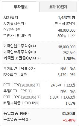 시가총액 855억원으로 코스닥 874위를 기록하고 있으며, 외국인소진율은 5.25%입니다. 2020년 6월 기준, PER 10.62배, PBR 2.18배이며, 배당수익률은 없습니다.