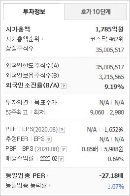 시가총액 1,785억원으로 코스닥 462위를 기록하고 있으며, 외국인소진율은 9.19%입니다. 2020년 8월 기준, PBR 0.85배, BPS 5,988원이며, 배당수익률(2020.02)은 0.69% 입니다.