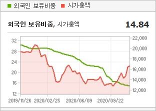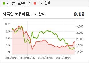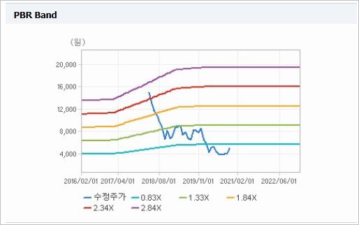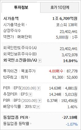 시가총액 1조6,709억원으로 코스피 138위를 기록하고 있으며, 외국인소진율은 14.84%입니다. 2020년 6월 기준 PER 14.63배, PBR 0.37배이며, 배당수익률(2019.12)은 1.4%입니다.