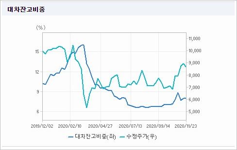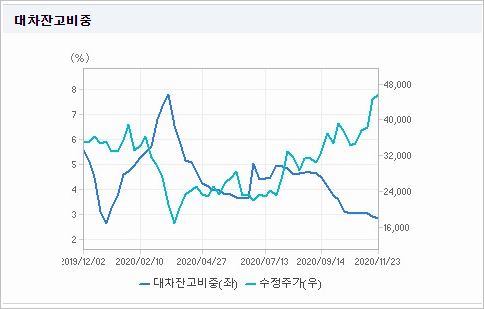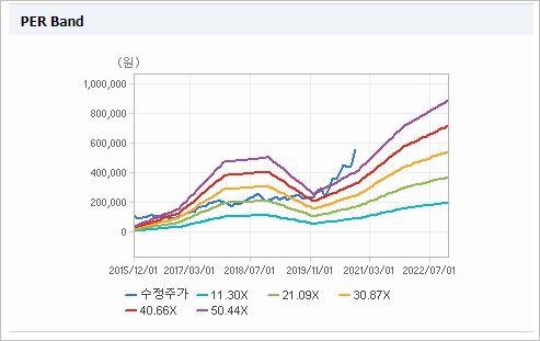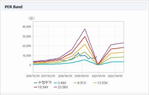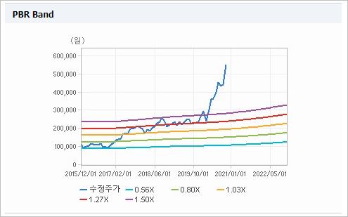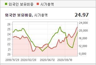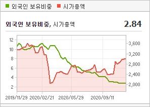 시가총액 37조8,893억원으로 코스피 9위를 기록하고 있으며, 외국인소진율은 43.75%입니다. 2020년 9월 기준, PER 187.99배, PBR 2.93배이며, 배당수익률(2019.12)은 0.18%입니다.