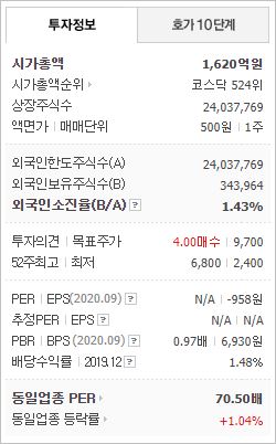 시가총액 1,620억원으로 코스닥 524위를 기록하고 있으며, 외국인소진율은 1.43%입니다. 2020년 9월 기준, PBR 0.97배, BPS 6,930원이며, 배당수익률(2019.12)은 1.48%입니다.