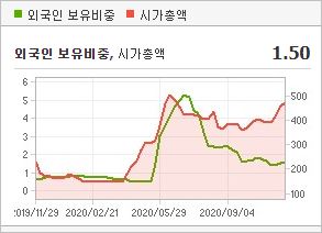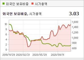 시가총액 466억원으로 코스닥 1214위를 기록하고 있으며, 외국인소진율은 1.56%입니다. 2020년 9월 기준, PER 9.59배, PBR 2.17배이며, 배당수익률은 없습니다.
