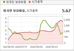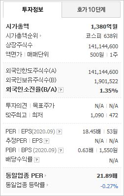 시가총액 1,646억원으로 코스닥 515위를 기록하고 있으며, 외국인소진율은 1.32%입니다. 2020년 9월 기준, PBR 2.14배, BPS 3,654원이며, 배당수익률은 없습니다.