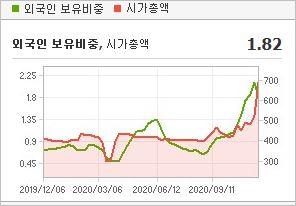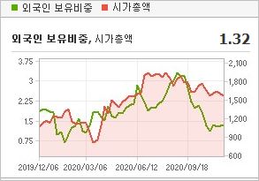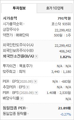 시가총액 791억원으로 코스닥 935위를 기록하고 있으며, 외국인소진율은 1.82% 입니다. 2020년 9월 기준, PBR 1.4배, BPS 2,530원이며, 배당수익률은 없습니다.