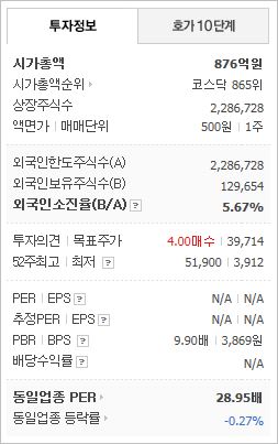 시가총액은 876억원으로 코스닥 865위를 기록하고 있으며, 외국인소진율은 5.67%입니다. 2020년 6월에 상장된 업체라 아직 구체적인 재무 정보는 없으며, PBR은 9.9배입니다.