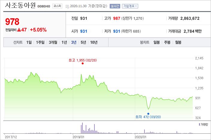 사조동아원은 시가총액 1,380억원으로 코스피 638위를 기록하고 있으며, 외국인소진율은 1.35%입니다. 2020년 9월 기준, PER 18.45배, EPS 53원, PBR 0.63배이며, 배당수익률은 없습니다.