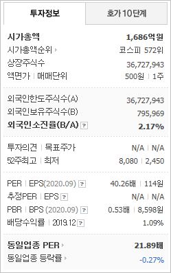 시가총액 1,686억원으로 코스피 572위를 기록하고 있으며, 외국인소진율은 2.17%입니다. 2020년 9월 기준, PER 40.26배, PBR 0.53배이며, 배당수익률(2019.12)은 1.09% 입니다.