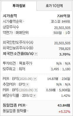 시가총액 720억원으로 코스피 849위를 기록하고 있으며, 외국인소진율은 3.7%입니다. 2020년 9월 기준, PER 14.87배, PBR 0.59배이며, 배당수익률(2019.12)은 1.42% 입니다.