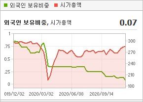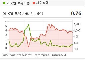 시가총액 2,399억원으로 코스닥 346위를 기록하고 있으며, 외국인소진율은 0.56%입니다. 2020년 6월 기준, PBR 3.06배, BPS 1,969원이며, 배당수익률은 없습니다.