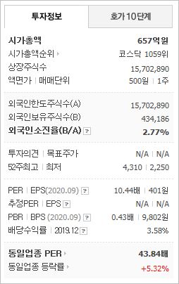 시가총액 657억원으로 코스닥 1059위를 기록하고 있으며, 외국인소진율은 2.77%입니다. 2020년 9월 기준, PER 10.44배, PBR 0.43배이며, 배당수익률(2019.12)은 3.58%입니다.