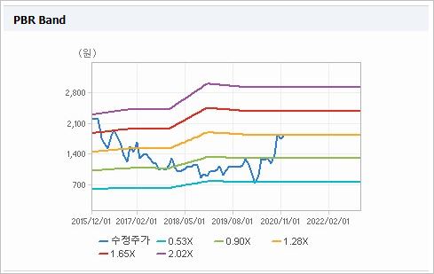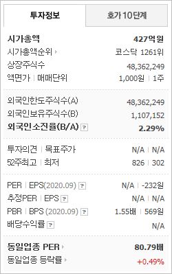 시가총액 427억원으로 코스닥 1261위를 기록하고 있으며, 외국인소진율은 2.29%입니다. 2020년 9월 기준, PBR 1.55배, BPS 569원이며, 배당수익률은 없습니다.
