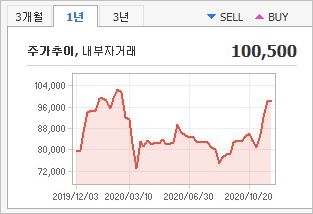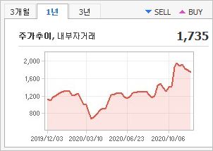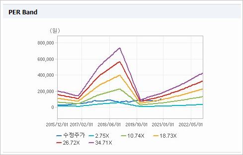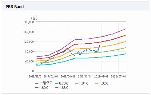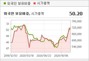 시가총액 79조3,523억원으로 코스피 2위를 기록하고 있으며, 외국인소진율은 50.2%입니다. 2020년 9월 기준, PER 27.65배, PBR 1.48배이며, 배당수익률(2019.12)은 0.92% 입니다.