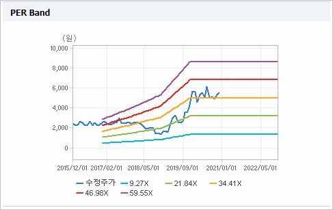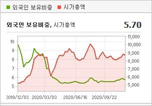 시가총액 9,045억원으로 코스닥 54위를 기록하고 있으며, 외국인소진율은 5.7%입니다. 2020년 9월 기준, PER 57.89배, PBR 2.65배이며, 배당수익률은 없습니다.