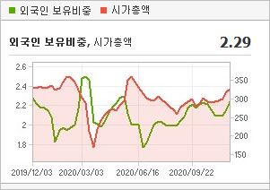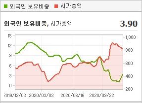 시가총액 849억원으로 코스닥 892위를 기록하고 있으며, 외국인소진율은 3.9%입니다. 2020년 9월 기준, PER 29.19배, PBR 1.2배이며, 배당수익률은 없습니다.