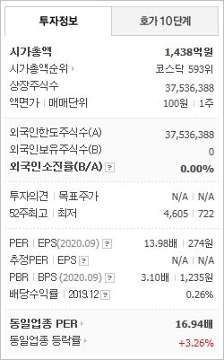 시가총액 1,438억원으로 코스닥 593위를 기록하고 있으며, 외국인소진율은 없습니다. 2020년 9월 기준, PER 13.98배, PBR 3.1배이며, 배당수익률(2019.12)은 0.26%입니다.
