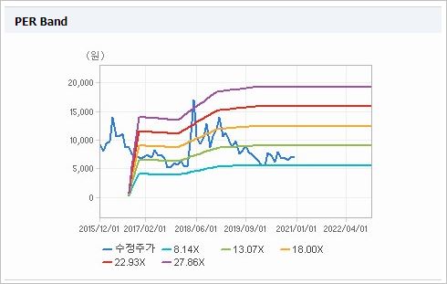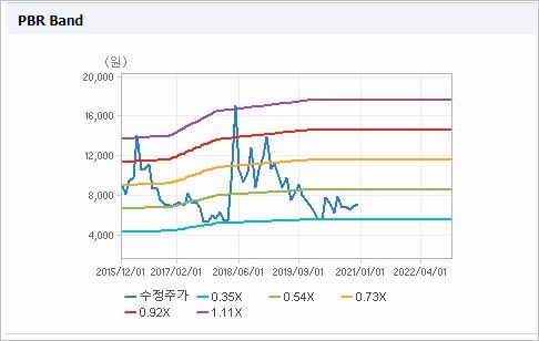 시가총액 7,550억원으로 코스피 227위를 기록하고 있으며, 외국인소진율은 2.25%입니다. 2020년 9월 기준, PER 7.4배, PBR 0.6배이며, 배당수익률(2019.12)은 4.31%입니다.