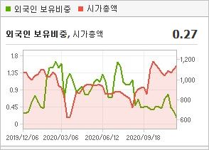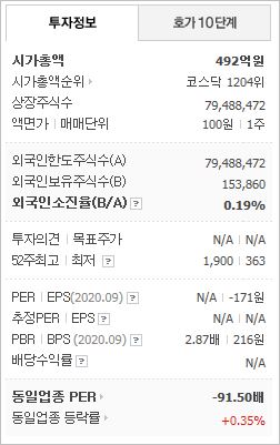 시가총액 492억원으로 코스닥 1204위를 기록하고 있으며, 외국인소진율은 0.19%입니다. 2020년 9월 기준, PBR 2.87배, BPS 216원이며, 배당수익률은 없습니다.