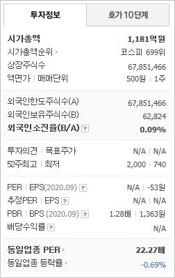 시가총액은 1,181억원으로 코스피 699위를 기록하고 있으며, 외국인소진율은 0.09%입니다. 2020년 9월 기준, PBR 1.28배, BPS 1,363원이며, 배당수익률은 없습니다.