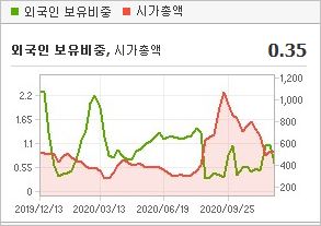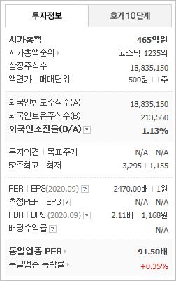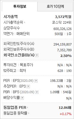 시가총액 3,572억원으로 코스닥 224위를 기록하고 있으며, 외국인소진율은 2.5%입니다. 2020년 9월 기준, PER 198.33배, PBR 1.09배이며, 배당수익률은 없습니다.