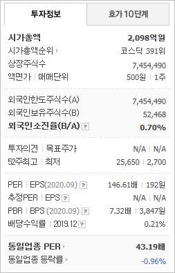 시가총액 2,098억원으로 코스닥 391위를 기록하고 있으며, 외국인소진율은 0.7%입니다. 2020년 9월 기준, PER 146.61배, PBR 7.32배이며, 배당수익률(2019.12)은 0.21%입니다.