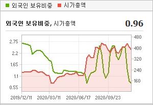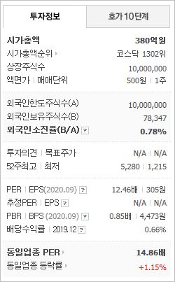 시가총액 380억원으로 코스닥 1302위를 기록하고 있으며, 외국인소진율은 0.78%입니다. 2020년 9월 기준, PER 12.46배, PBR 0.85배이며, 배당수익률(2019.12)은 0.66%입니다.