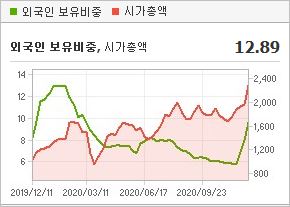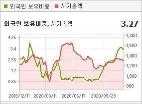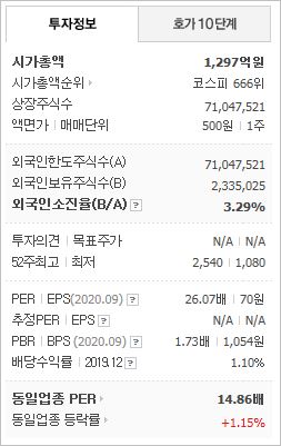 시가총액 1,297억원으로 코스피 666위를 기록하고 있으며, 외국인소진율은 3.29%입니다. 2020년 9월 기준, PER 26.07배, PBR 1.73배이며, 배당수익률(2019.12)은 1.1%입니다.