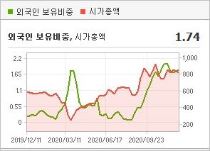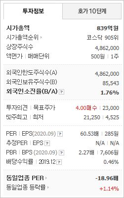 시가총액 839억원으로 코스닥 905위를 기록하고 있으며, 외국인소진율은 1.76%입니다. 2020년 9월 기준, PER 60.53배, PBR 2.27배이며, 배당수익률(2019.12)은 0.46%입니다.
