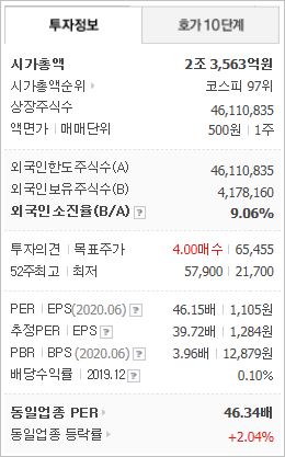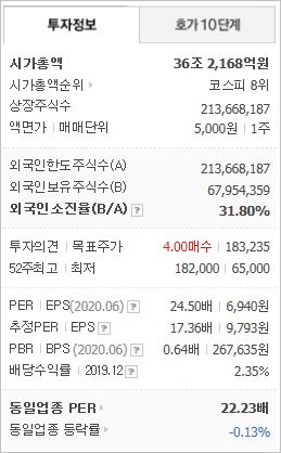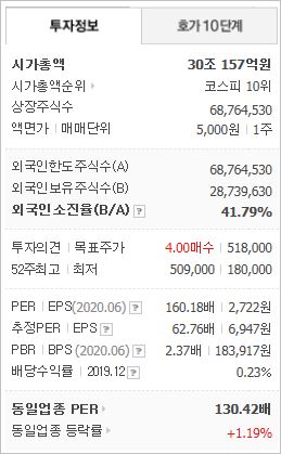 2020년 기준, ROE 3.9%, PER 61.89배(동종업계 130.42배), PBR 2.25배이며, 시가총액은 29조9,813억원으로 코스피 10위를 기록하고 있습니다. 외국인소진율은 41.79% 입니다.