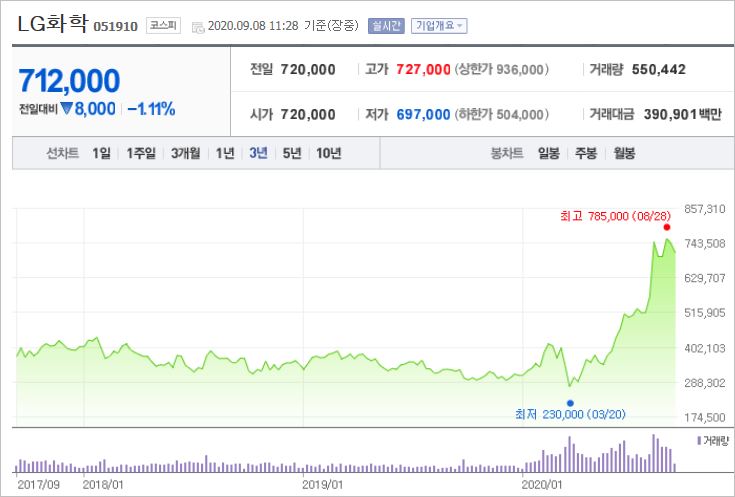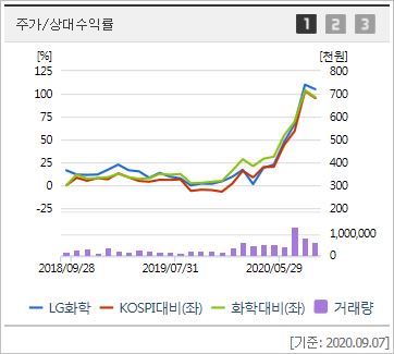 LG화학은 전지, 생명과학, 유리기판, 첨단소재 등의 사업을 영위하고 있는 기업을으로써 전기차에 들어가는 2차전지를 만드는 국내 대표기업입니다. 올해 초 전기차 주목시점부터 급등 추세를 유지하고 있습니다.