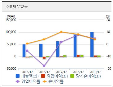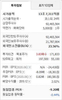 2020년 기준, ROE -10.44%, PER -8.14배(동종업종 -9.2배), PBR 0.81배이며, 시가총액 13조7,311억원으로 코스피 25위에 위치해 있습니다. 외국인 소진율은 23.56% 입니다.