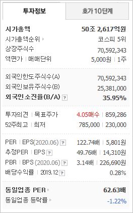 2020년 기준, ROE 6.4%, PER 50.32배(동종업종 62.63배), PBR 3.06배이며, 시가총액은 50조4,029억원으로 코스피 5위에 위치하고 있습니다. 외국인소진율은 35.95% 입니다.