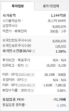 시가총액은 1,144억원으로 코스닥 644위이며, 2019년 기준, ROE 15.67%, PER 7.85배(동종업종 -71.7배), PBR 1.14배, 시가배당률은 1.06% 입니다.