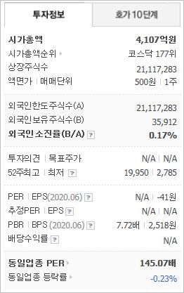 시가총액은 4,107억원으로 코스닥 177위에 위치하고 있으며, 외국인소진율 0.17%입니다. 2019년 기준 ROE -49.93%, PER -4배(동종업종 145.07배), PBR 2.23배 입니다.