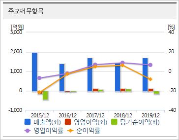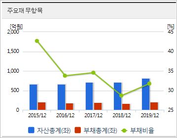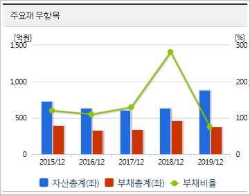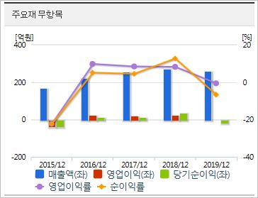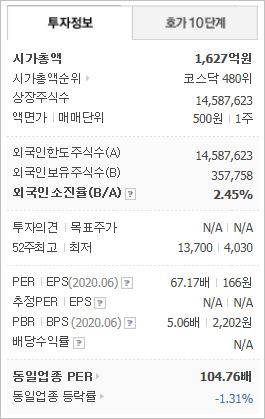 시가총액 1,627억원으로 코스닥 480위에 위치하고 있으며, 외국인소진율은 2.45% 입니다. 2019년 기준, ROE -5.15%, PER -57.88배(동종업종 104.76배), PBR 3.03배, 배당은 없습니다.