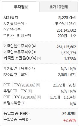 시가총액은 5,275억원으로 코스닥 126위에 위치하고 있으며, 외국인소진율은 1.73% 입니다. 2019년 기준, ROE -6.43%, PER -20.13배(동종업종 74.87배), PBR 1.37배, 시가배당은 없습니다.
