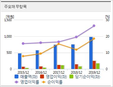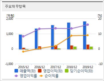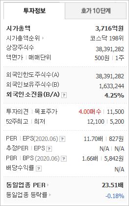 시가총액은 3,712억원으로 코스닥 198위이며, 외국인소진율은 4.25% 입니다. ROE 14.63%, PER 11.67배, PBR 1.6배이며 배당률은 2019년까지 없었습니다.