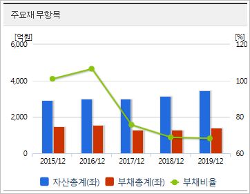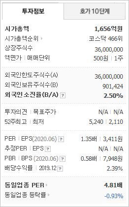 시가총액 1,654억원으로 코스닥 466위를 기록하고 있으며, 외국인소진율은 2.5% 입니다. 2019년 기준, ROE 49.82%, PER 1.22배, PBR 0.48배이며, 배당률은 3.31%로 높은 편입니다.