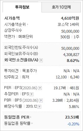 시가총액은 4,595억원으로 코스닥 149위에 위치해있으며, 외국인소진율은 8.62% 입니다. 2019년 기준, ROE 16%, PER 20.58배, PBR 3.24배이며 시가배당은 5.44%로 국내 주식 중에서도 매우 높은 편에 속합니다.