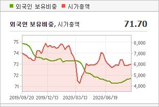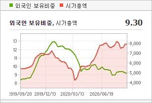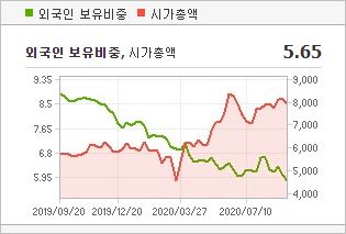 시가총액은 5,933억원으로 코스피 258위에 위치하고 있으며, 외국인소진율은 71.7% 입니다. 2019년 기준, ROE 2.44%, PER 47.33배, PBR 1.13배이며, 배당률은 0.39% 입니다.