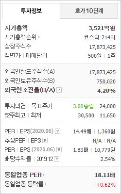 시가총액 3,521억원으로 코스닥 214위에 위치하고 있으며, 외국인소진율은 4.2% 입니다. 2020년 기준, ROE 16.26%, PER 13.39배, PBR 1.88배이며, 시가배당률(2019년 기준)은 1.92% 입니다.