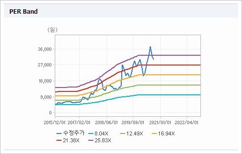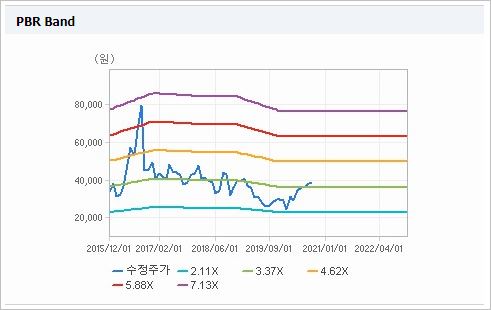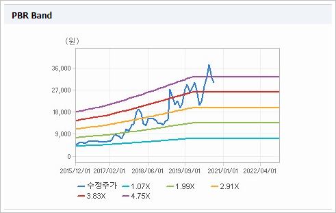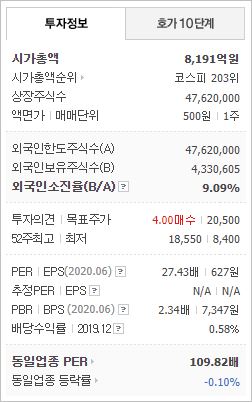 시가총액은 8,191억원으로 코스피 203위를 기록하고 있으며, 외국인소진율은 9.09% 입니다. 2020년 기준, ROE 10.07%, PER 24.98배, PBR 2.23배이며, 배당률은(2019년 기준) 0.6% 입니다.