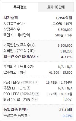 시가총액은 1,956억원으로 코스닥 410위를 기록하고 있으며, 외국인소진율은 4.77% 입니다. 2019년 기준, ROE 20.57%, PER 22.1배, PBR 4.04배이며, 배당률은 1.09% 입니다.