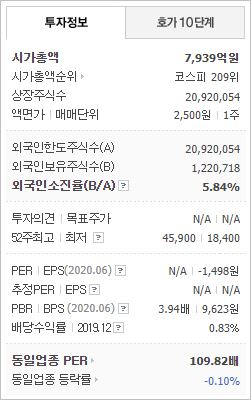 시가총액은 7.939억원으로 코스피 209위에 위치하고 있으며, 외국인소진율은 5.84% 입니다. 2019년 기준, ROE -10.31%, PER -26.14배, PBR 2.83배이며, 배당률은 1.07% 입니다.